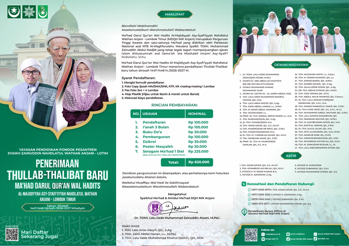 Penerimaan tullab dan thalibat baru ini tidak hanya dimaknai sebagai proses akademik, tetapi juga sebagai ikhtiar menjaga dan memakmurkan peninggalan perjuangan keilmuan Maulana Syaikh TGKH Muhammad Zainuddin Abdul Majid. Pihak Ma’had juga mengajak masyarakat untuk berperan aktif menyampaikan informasi pendaftaran kepada keluarga dan kerabat sebagai bagian dari amal jariah yang pahalanya terus mengalir.